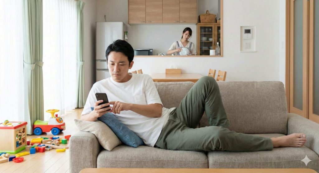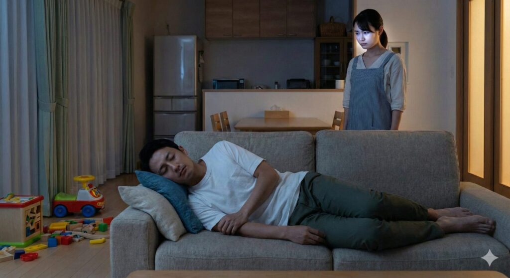 ある夜、夜泣きする子どもを抱いてリビングに行くと、夫がソファで気持ちよさそうに寝ているのが見えました。